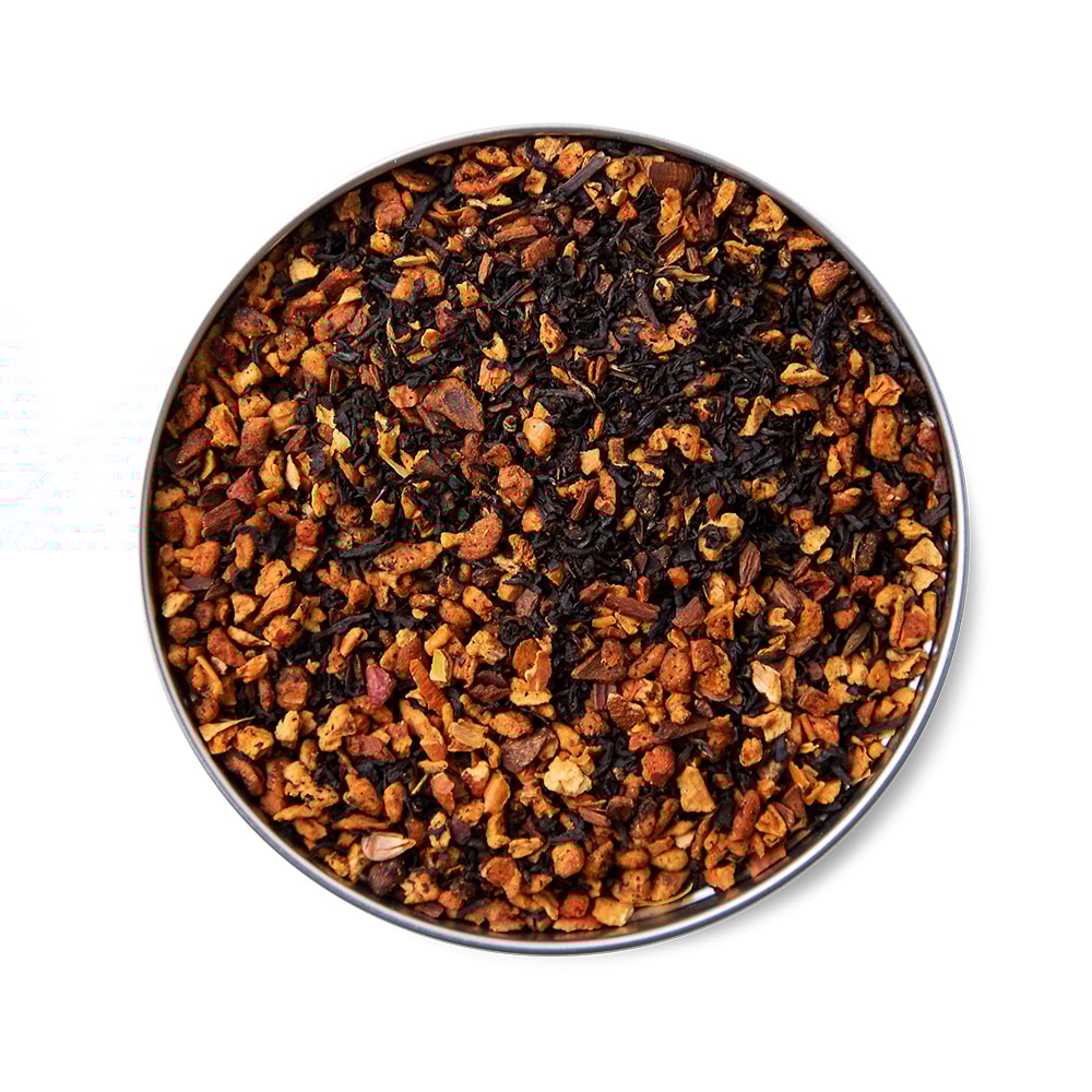 Misto de chá preto, maçã e canela e sabor canela.